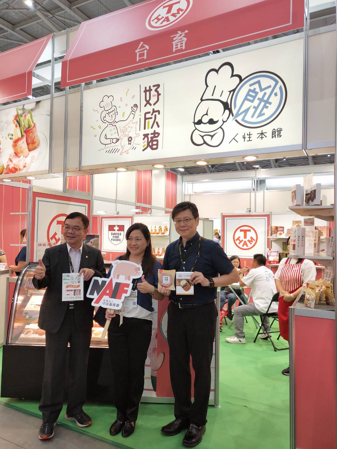 特別感謝 畜產會執行長 邱創進(左)/中央處產會 高級專員 黃貞綾(中)/中央畜產會 驗證組課長 梁啟峰(右) 蒞臨指導 2019台北國際食品展覽會-CAS臺灣豬肉館台畜櫃位 讚賞公司產品優良、美味又安心及合影留念